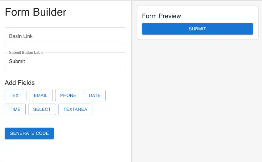I have created an easy-to-use form builder that generates HTML code for any form you’d like to create, eliminating the need to write code manually. Here is a screenshot of the form builder: