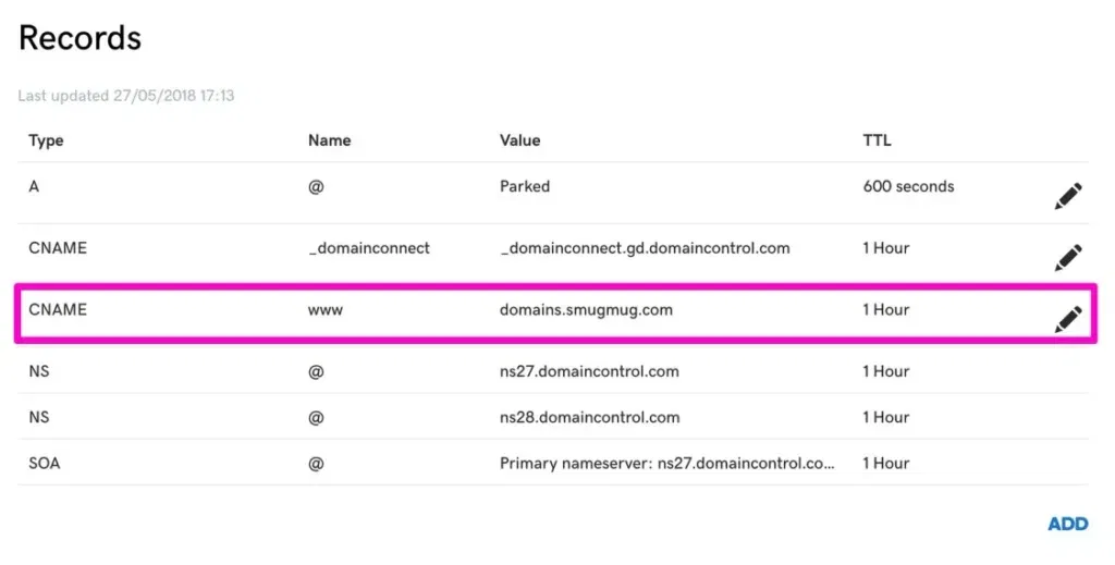 You can ignore all of the records that you are seeing, except the www CNAME record – click on the PEN icon as on my above screenshot and now, we will point this record to domains.smugmug.com