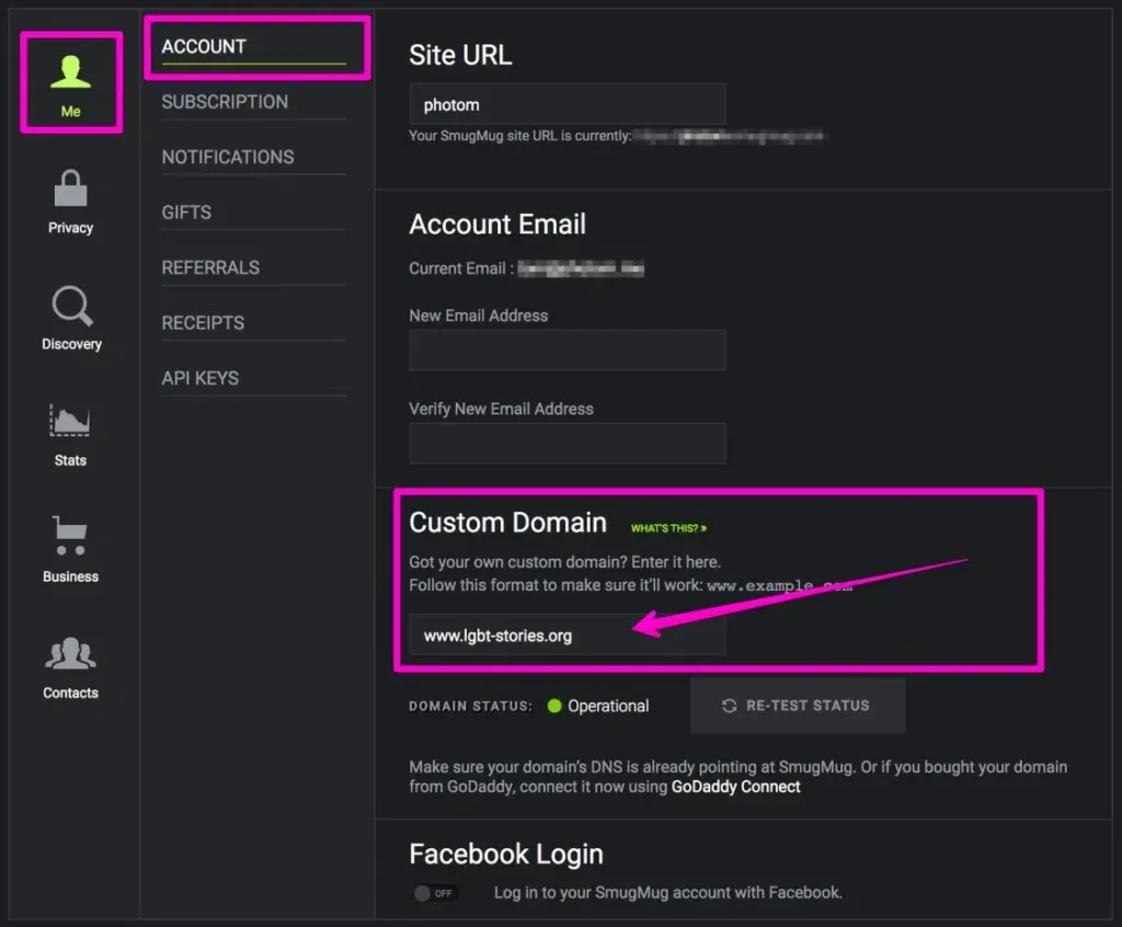 Log in to your SmugMug account → open ACCOUNT SETTINGS → ACCOUNT → CUSTOM DOMAIN enter your custom domain address including ‘www’ at the beginning of the link: